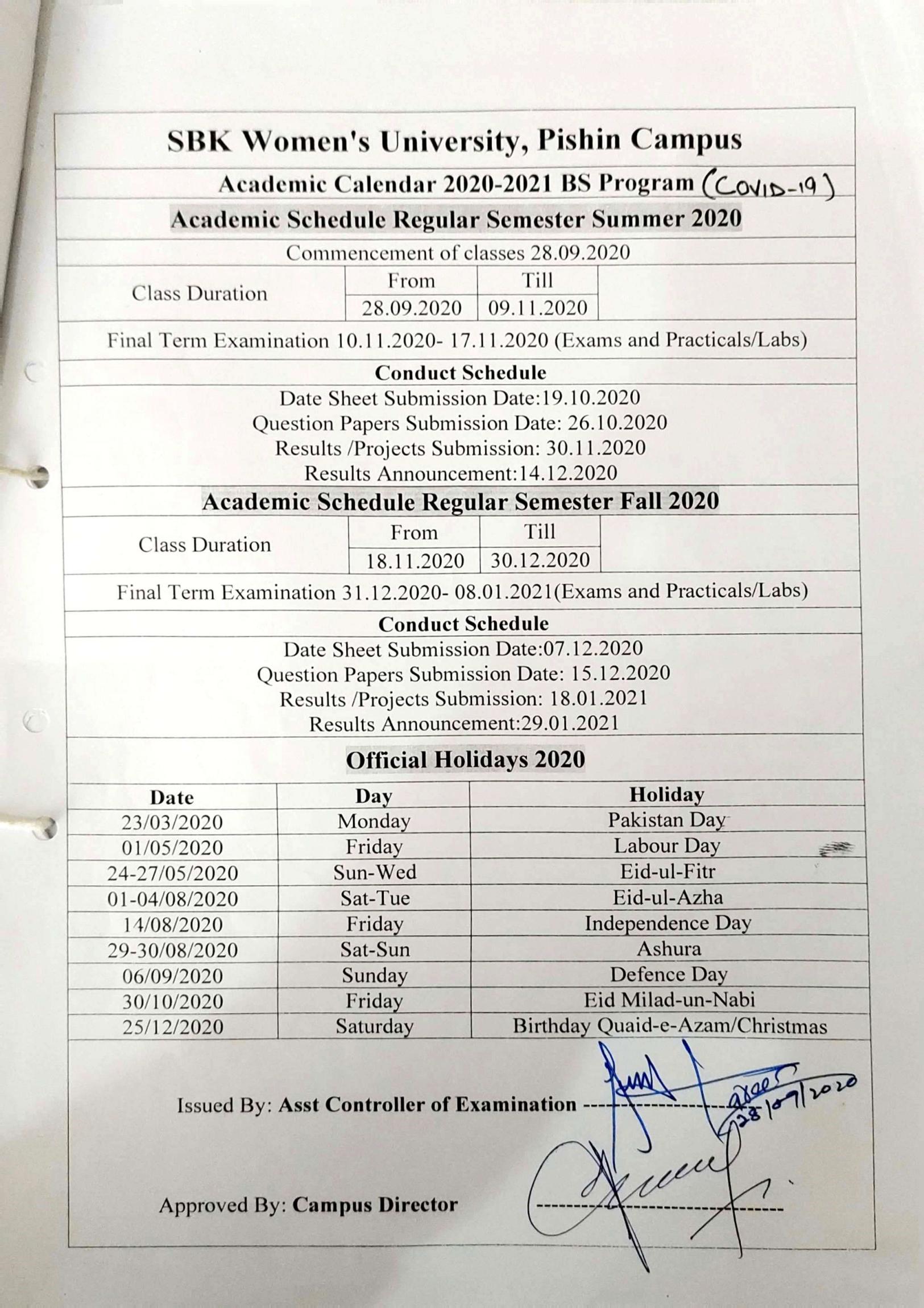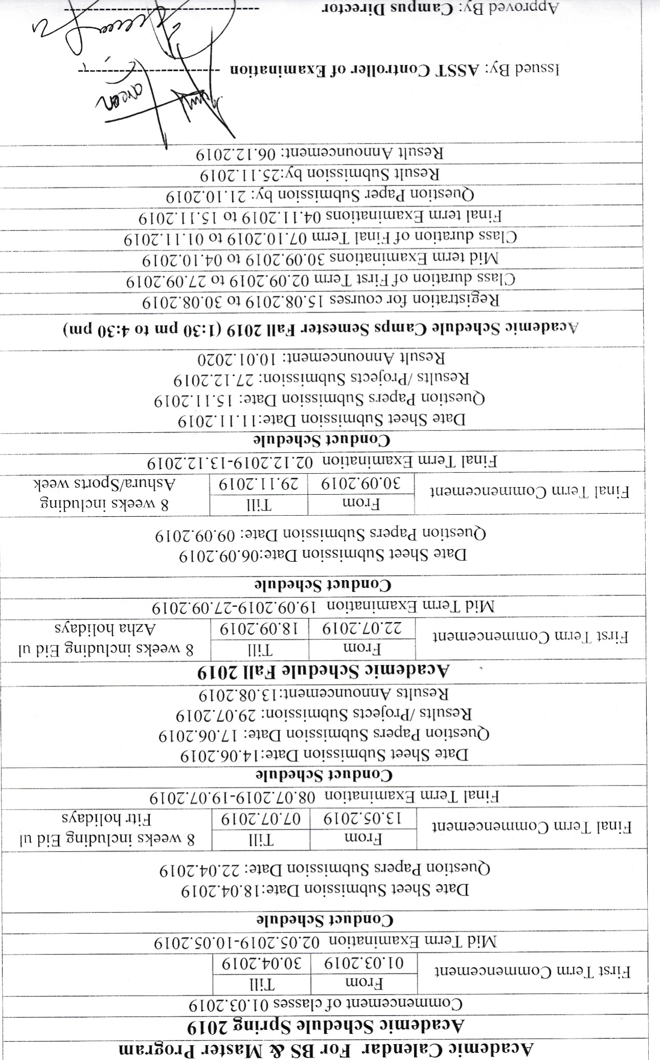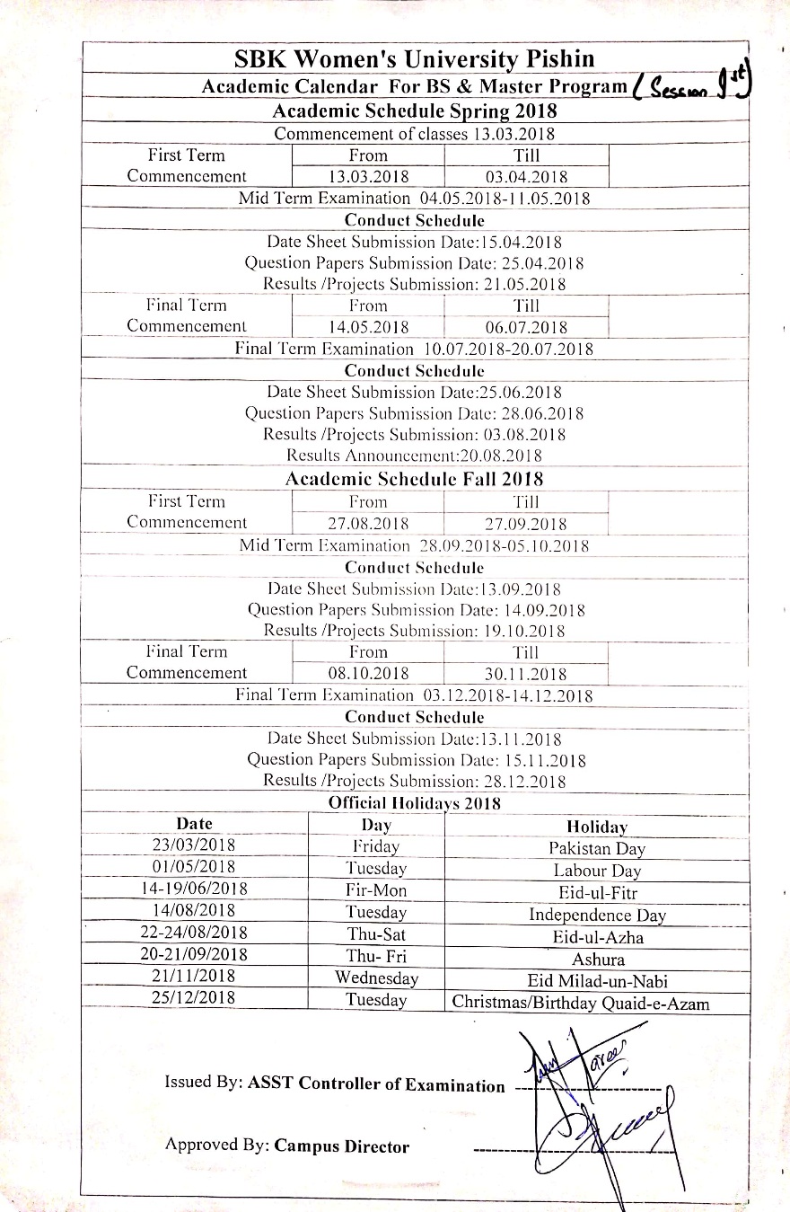 Department of Examination Academic Calendar BS & Master Spring and Fall 2018 For BS Program Session: 2018-2022 BS & Master Spring and Fall 2019 BS & Master Spring and Fall 2020